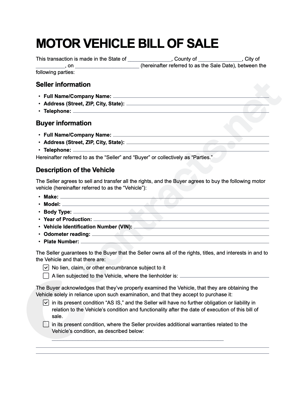 Free Motor Vehicle Bill of Sale Form For a Car PDF Word