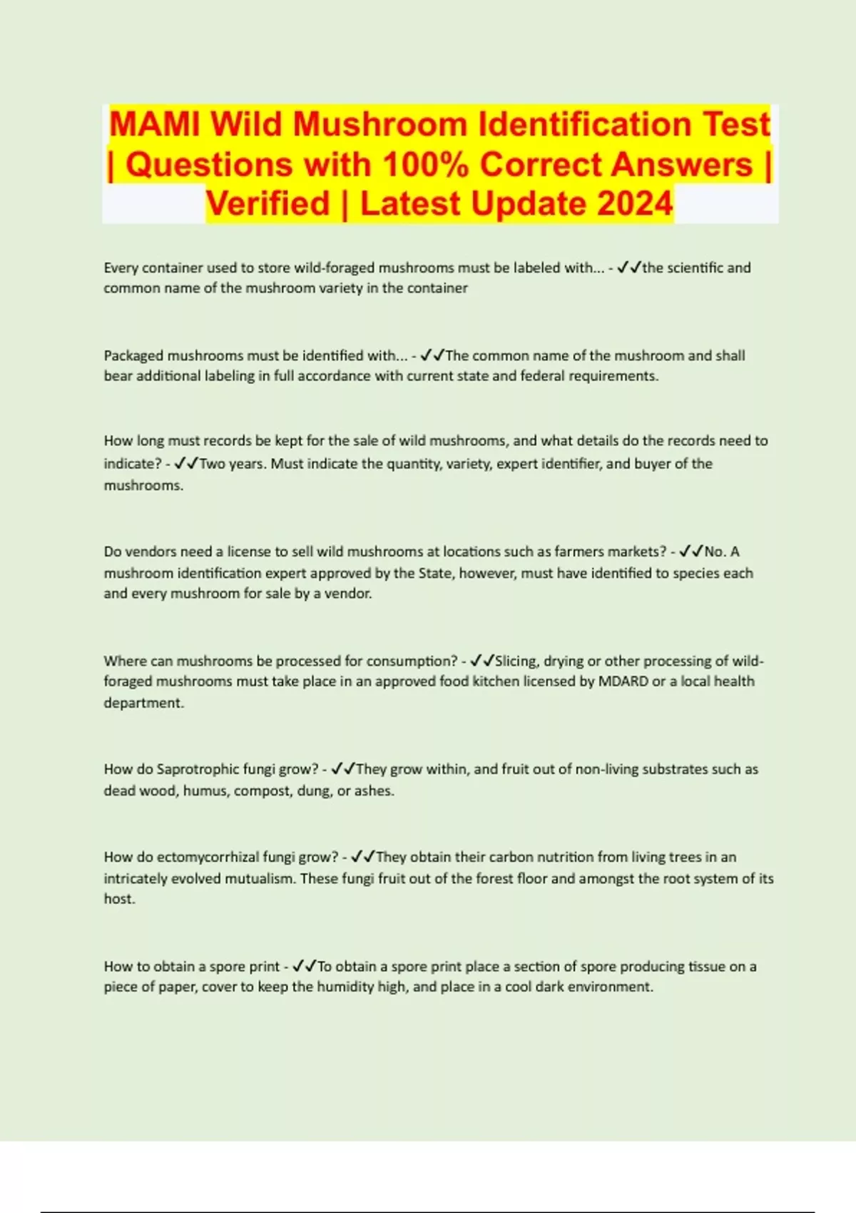MAMI Wild Mushroom Identification Test Questions with 100% Correct