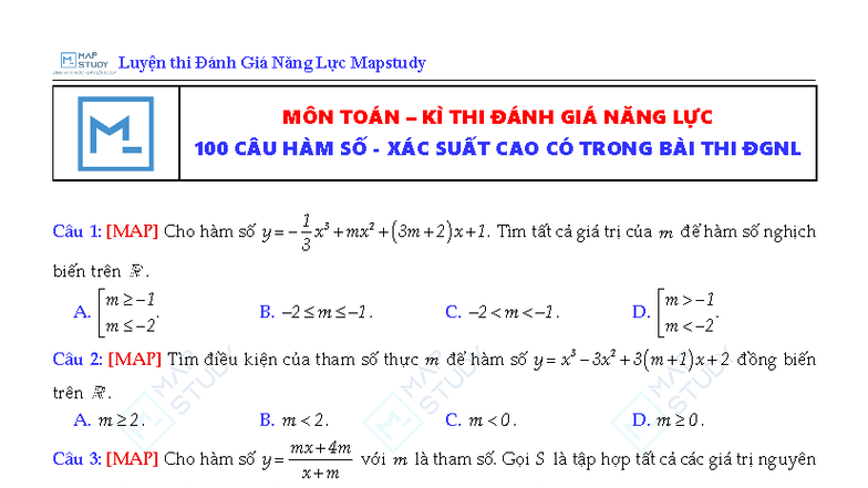 Luyện thi Đánh Giá Năng Lực Môn Toán: 100 Câu Hỏi Hàm Số Studocu