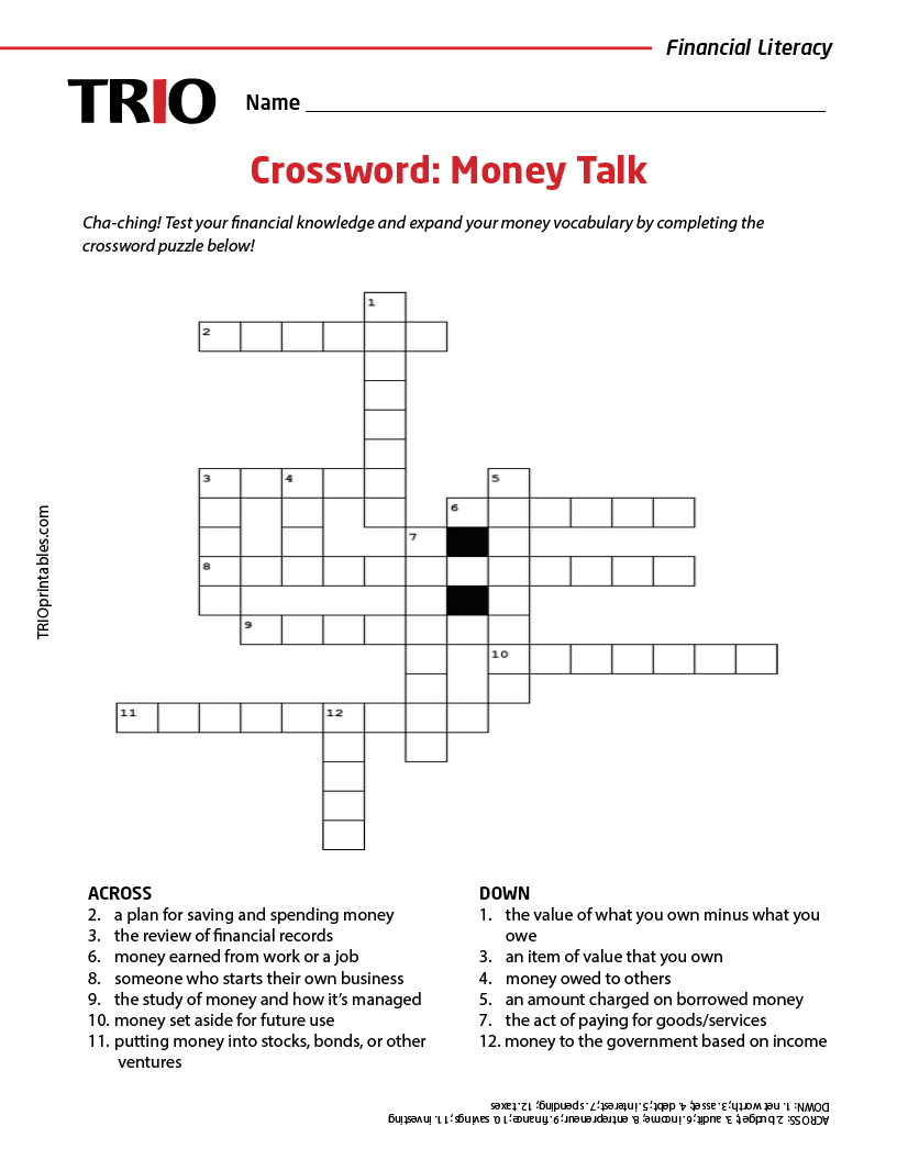 Crossword: Money Talk Activity Sheet TRIO Printables