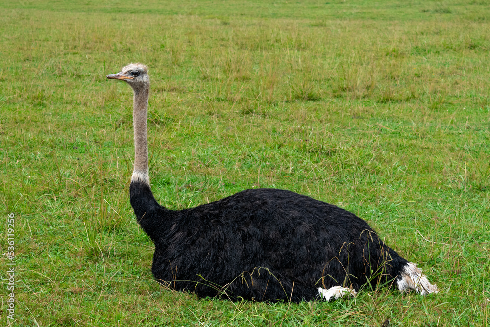 Avestruz macho sentado de perfil sobre la verde hierba Stock Photo