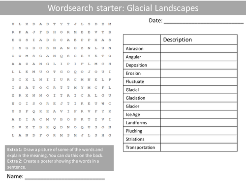 Geography Glacial Glacier Landscapes KS3 GCSE Wordsearch Crossword