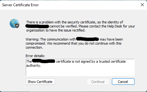 The server certificate is invalid Please contact your IT administrator