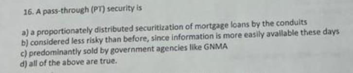 Solved 16 A pass through (PT) security is a) a Chegg com