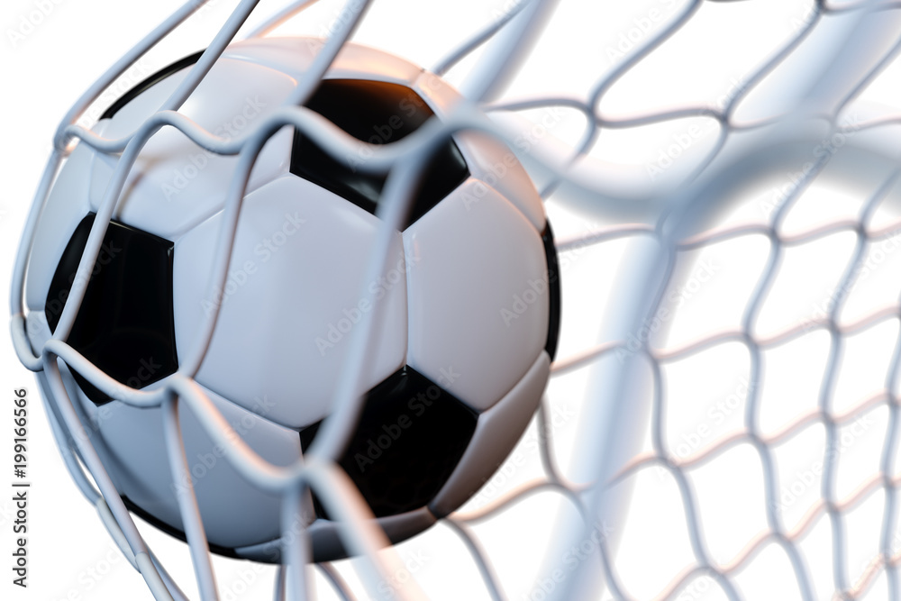 3d rendering soccer ball in goal in motion Soccer ball in net in