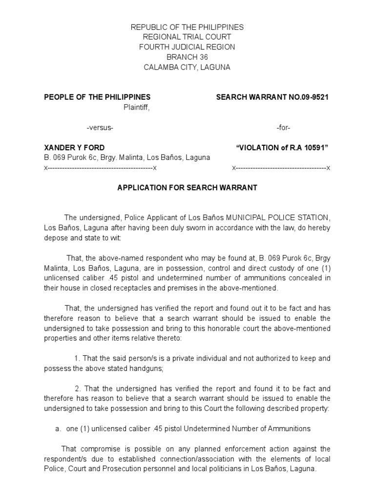 Application FOR Search Warrant REPUBLIC OF THE PHILIPPINES REGIONAL