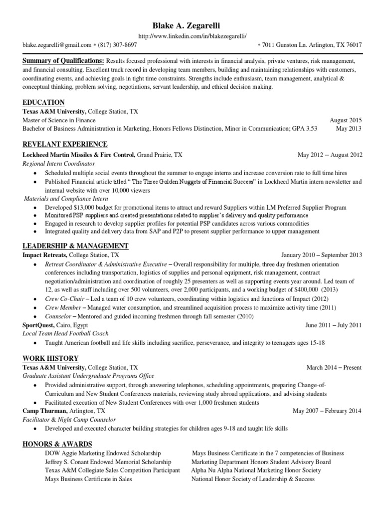Blake Zegarelli Goldman Sachs Resume PDF Supply Chain Business