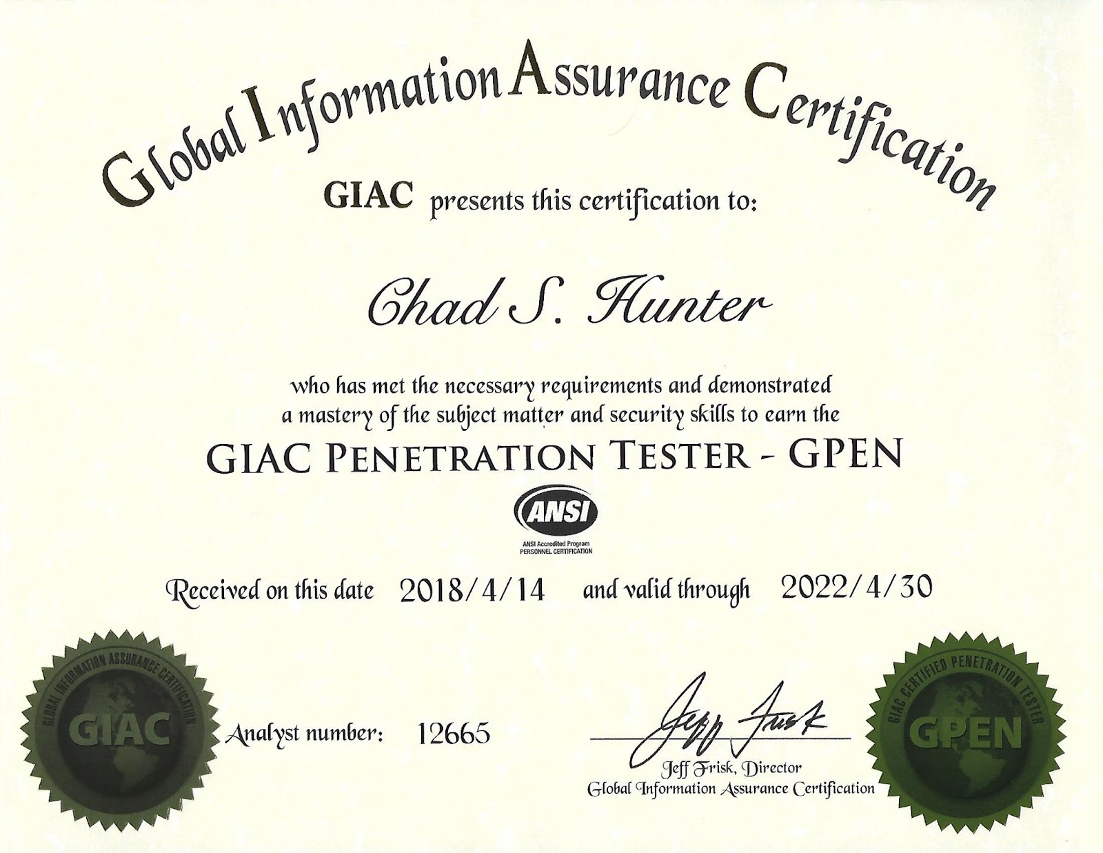 New certification achieved: GIACTester (GPEN) by GIAC