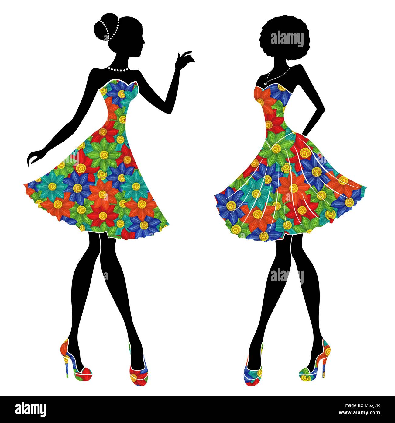 Graceful stylish young models in short dresses with motley multicolor