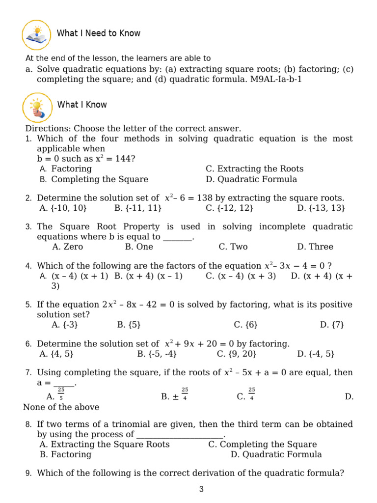 GRADE 9 MODUE 2 PDF Quadratic Equation Factorization
