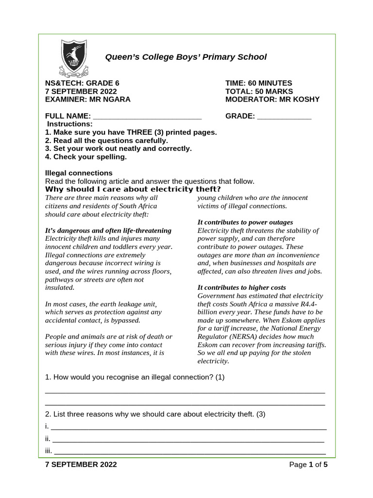 GRADE 6 NS TEST 7 SEPTEMBER 2022 PDF Electricity Insulator