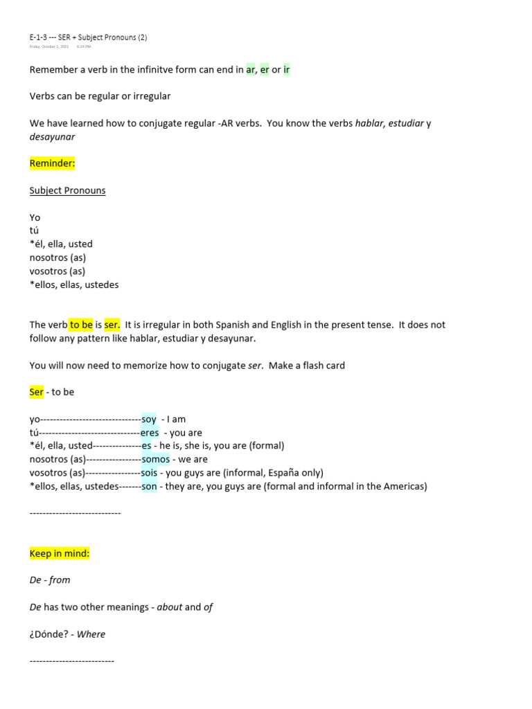 Ser and Subject Pronouns Practice Spanish Worksheet Worksheets Library
