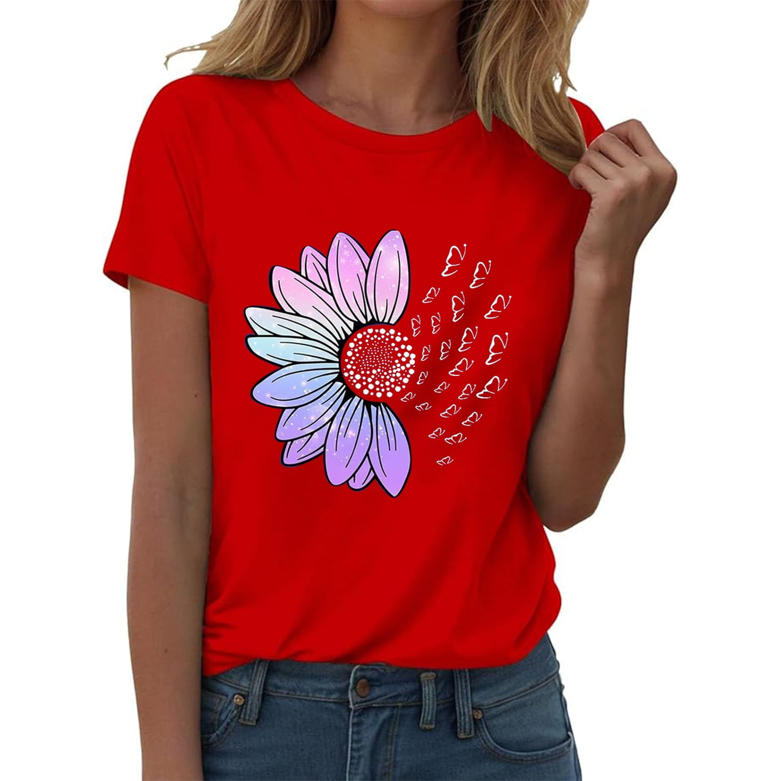 Sunflower Shirts for Women Flower Graphic Loose Summer Tees Crew Neck