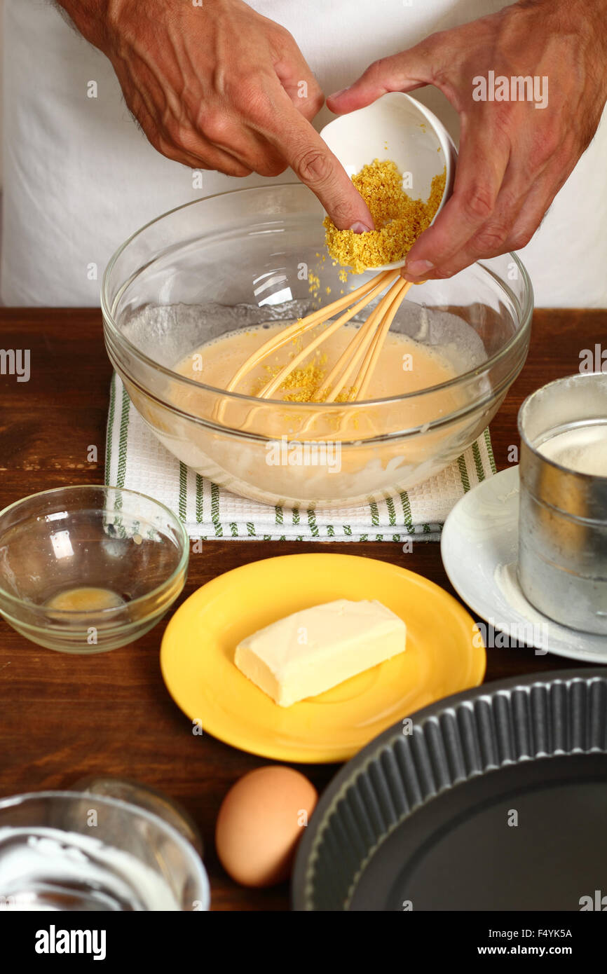Making Sour Cream Lemon Cake Adding grated lemon peel into batter
