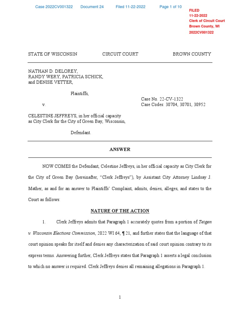 Green Bay Clerk #39 s Legal Answer in Election Case PDF Complaint