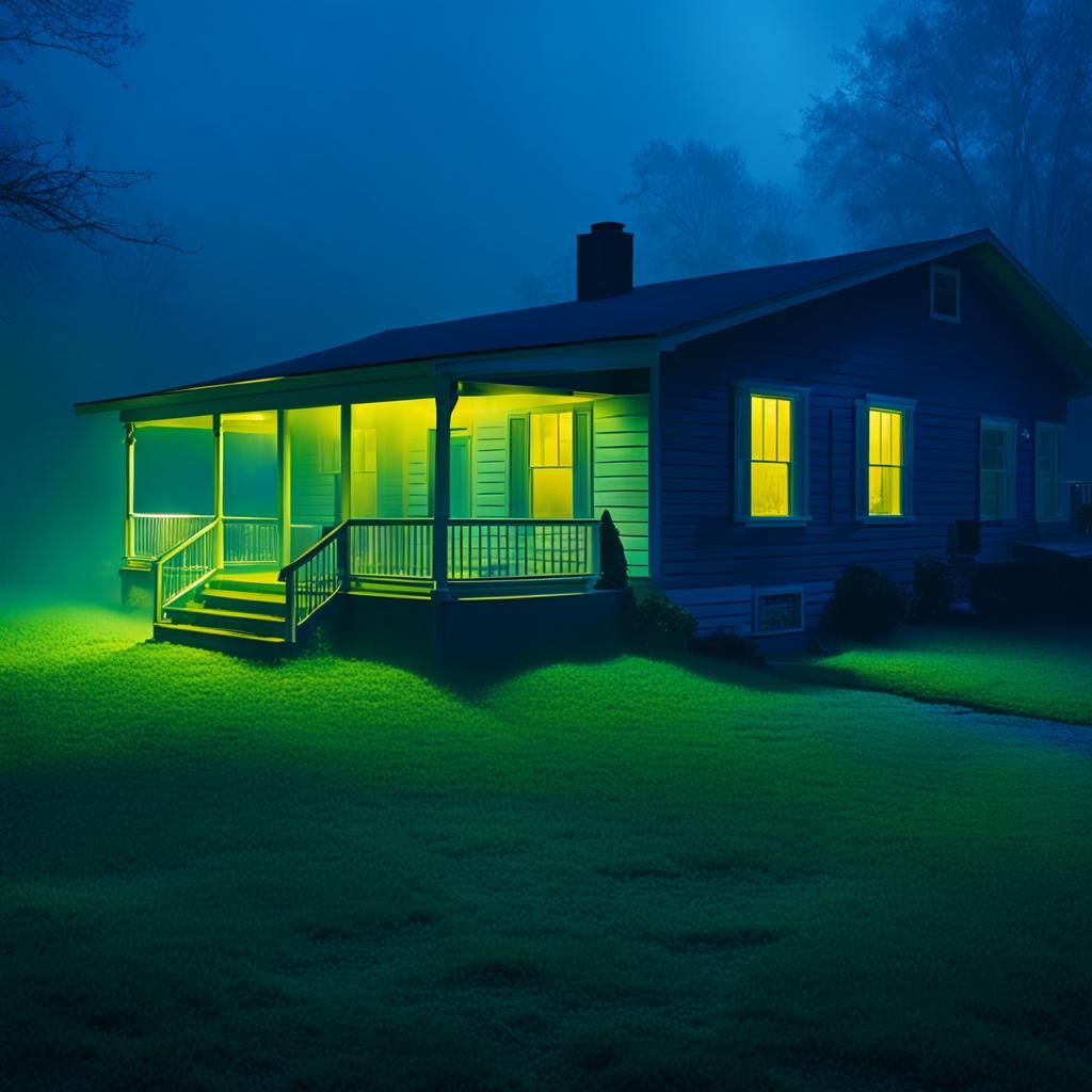 Rundown 1955 single level home with night time Dark blue Foggy glow
