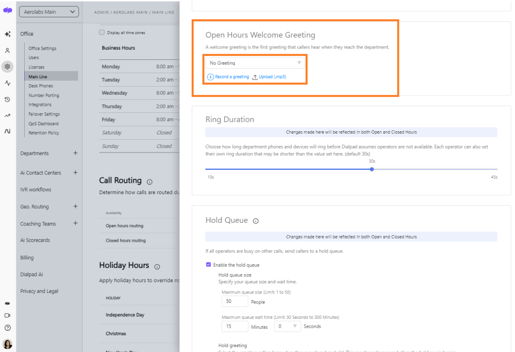 Dialpad Mainline Welcome Greeting vs Voicemail Greeting