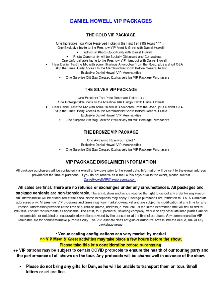 Daniel Howell concert VIP packages: Gold Silver and Bronze options