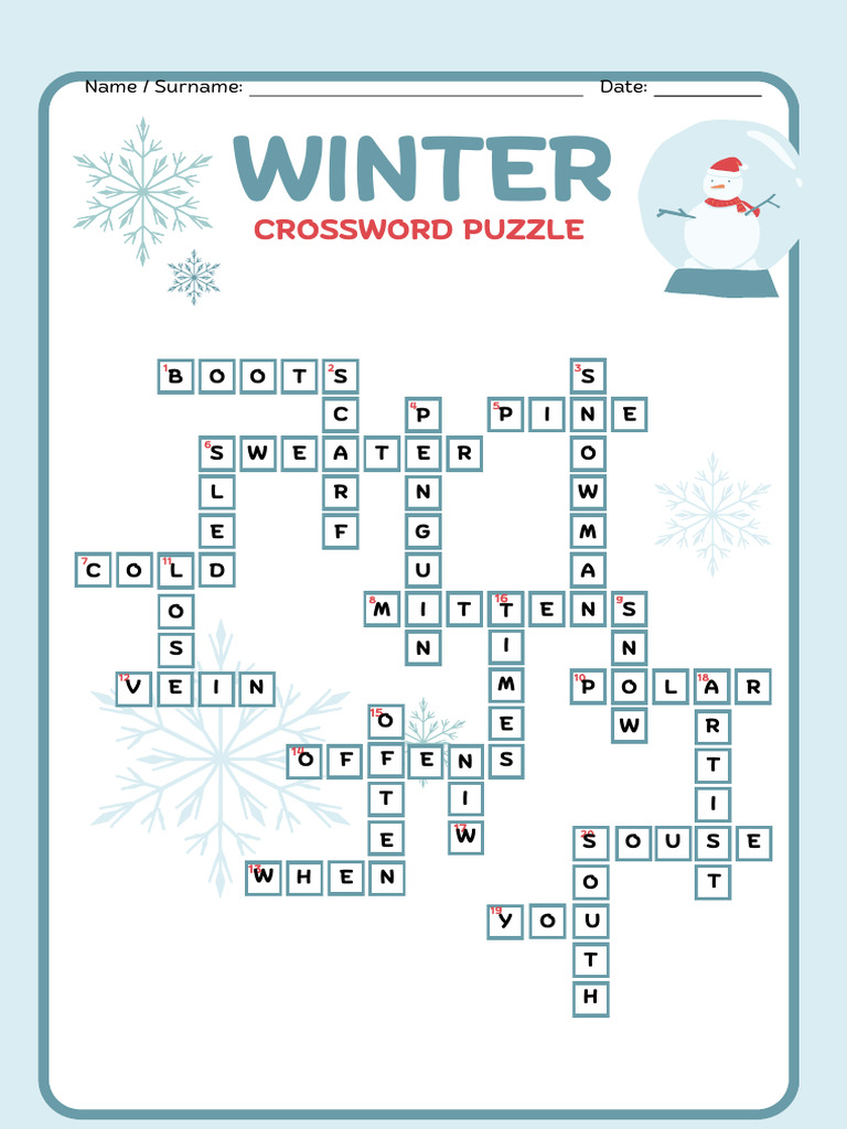 Winter Crossword Puzzle Worksheet in Grey Blue Cozy Style PDF PDF