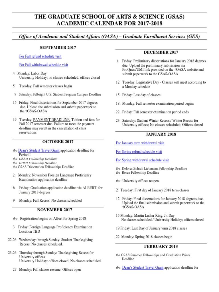 The Graduate School of Arts Science (Gsas) Academic Calendar For 2017