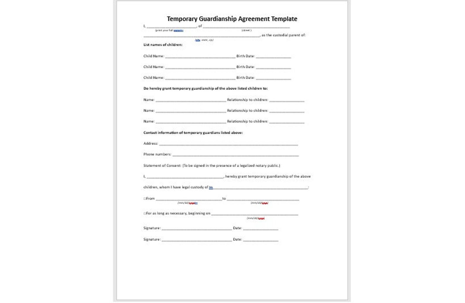 Free Template For Temporary Guardianship