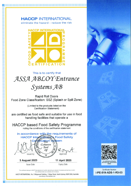 HACCP Certification for Rapid Roll Doors Assa Abloy Entrance Systems