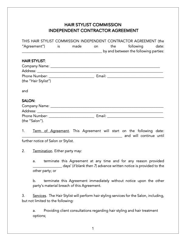 Hair Stylist Independent Contractor Agreement 1099 Hair Stylist