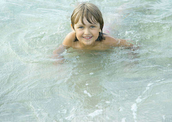 Girl wading in shallow water looking at camera Stock Photo Dissolve