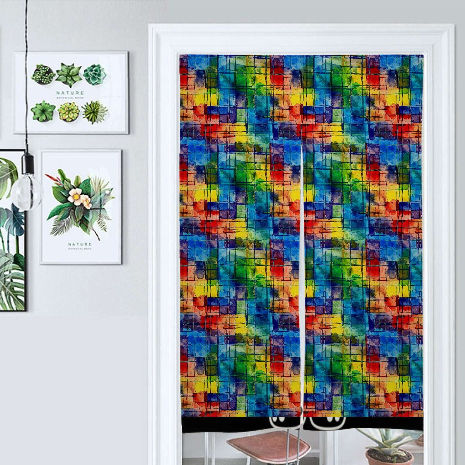 Colorful Abstract Watercolor Grid Pattern Door Curtain Nordic Living