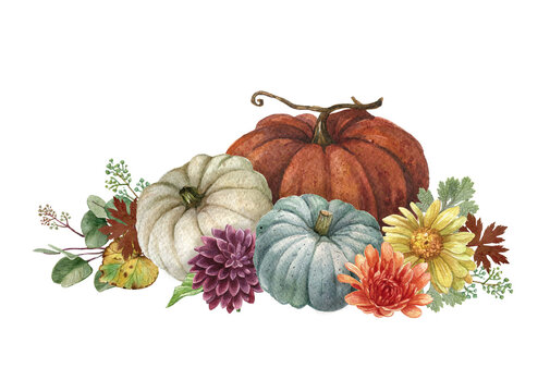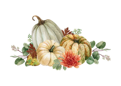 Fall Arrangements with Pumpkins Leaves Flowers Berries Watercolor