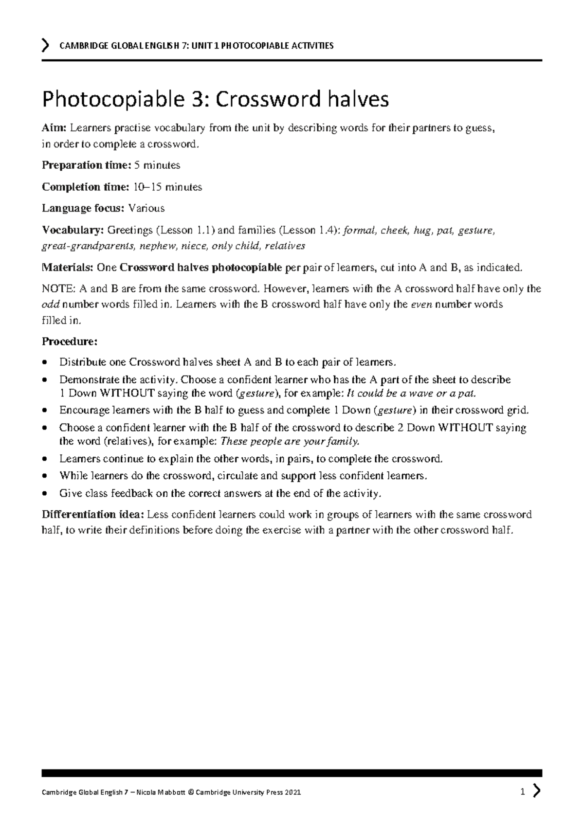 GE 7: Unit 1 Photocopiable Activities Crossword Halves Studocu