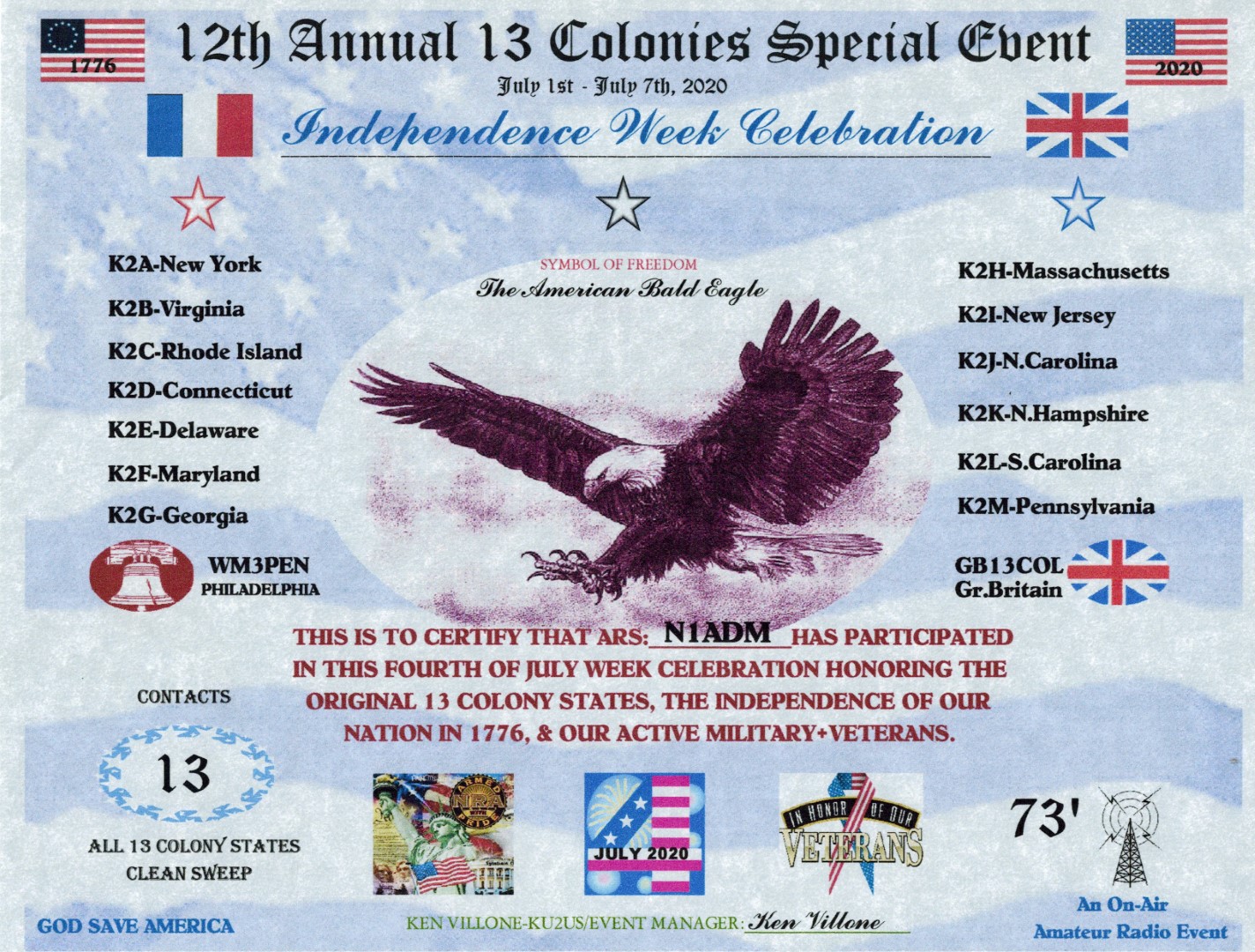 2020 Certificate for 13 Colonies Special Event N4MI Ham Radio