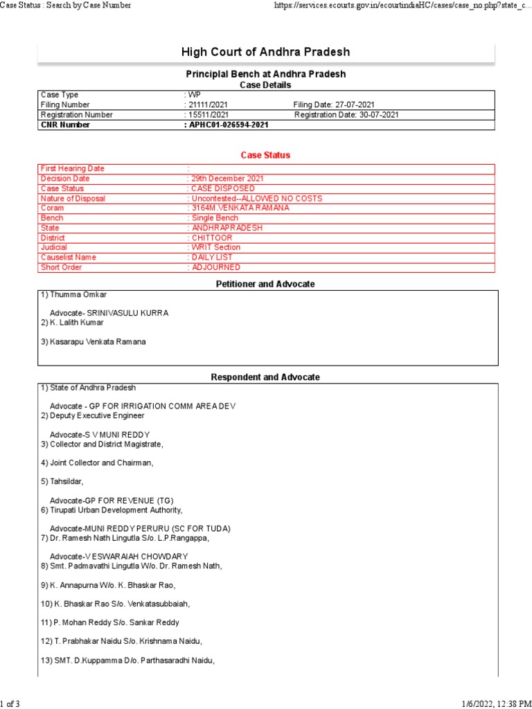 Case Status: High Court of Andhra Pradesh WP 15511/2021 PDF Courts