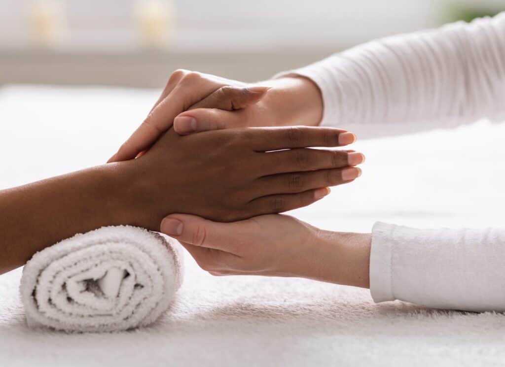 Masseuse Making Acupuncture Hand Massage for Black Woman Stock Photo