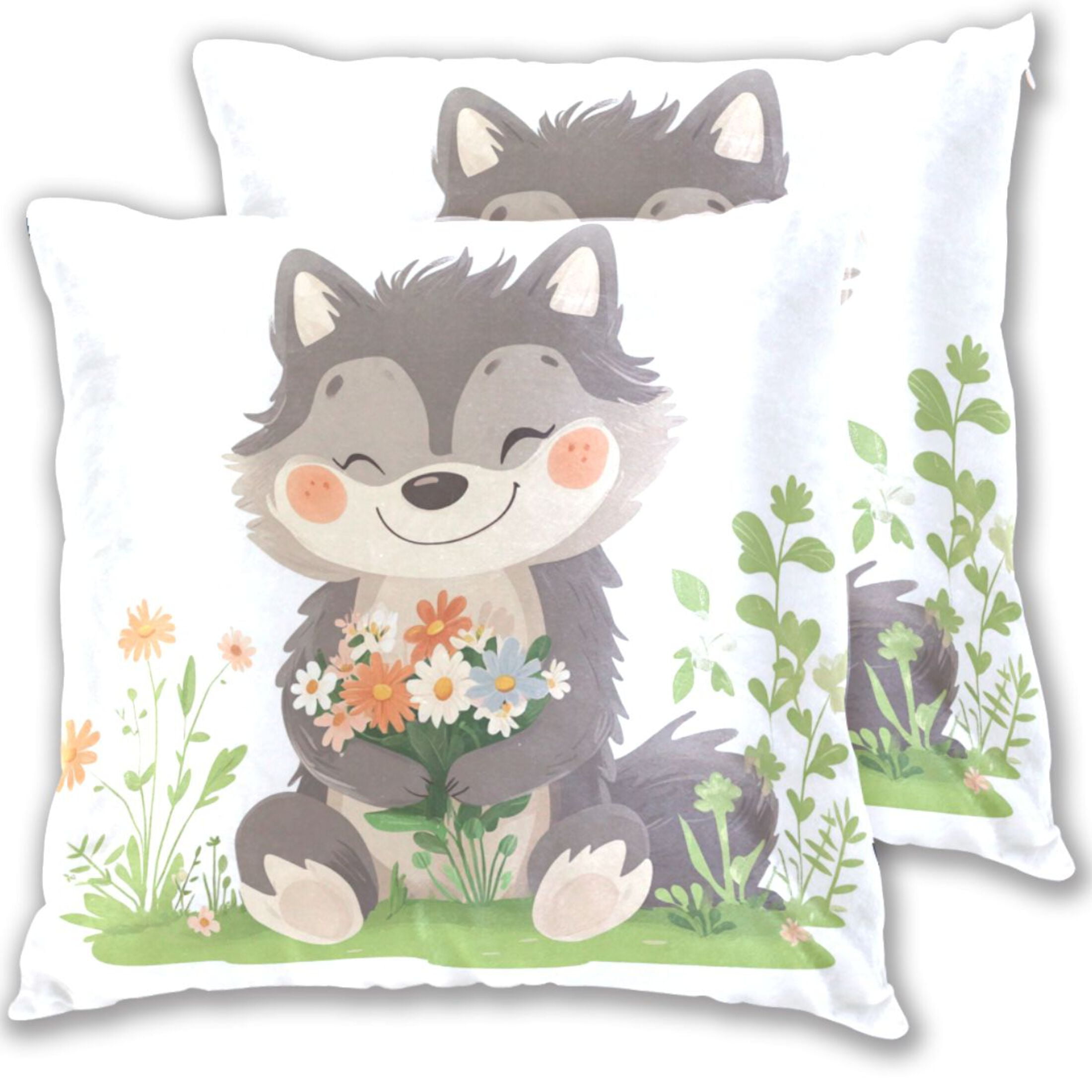 Happy Wolf Holds Flowers Throw Pillow Covers Pillowcases 20 x 20 Inch