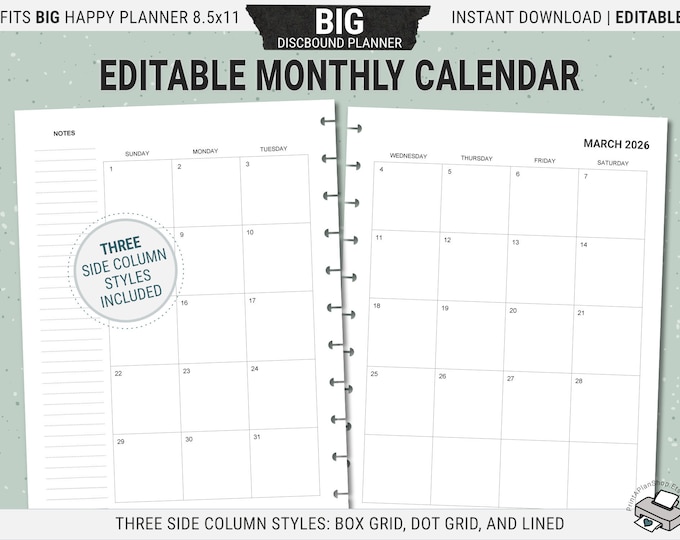 Undated Monthly Calendar Happy Planner Skinny Classic Insert Printable