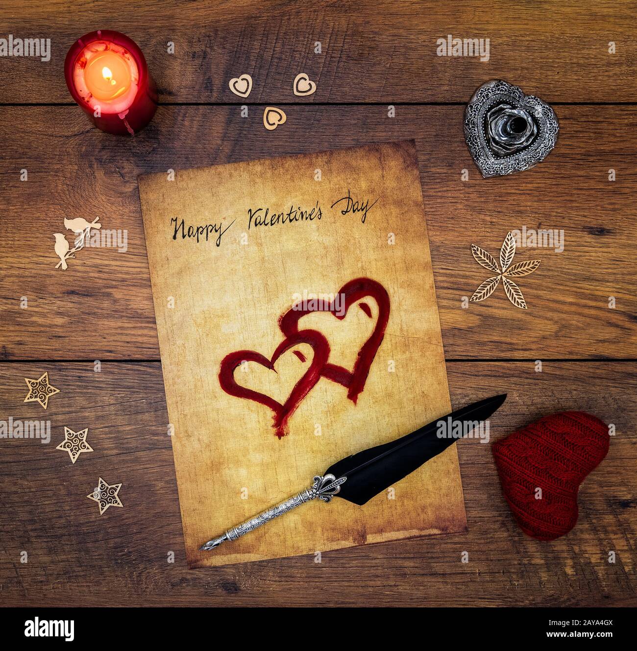 Happy Valentines Day card with love harts candle and quill Stock Photo