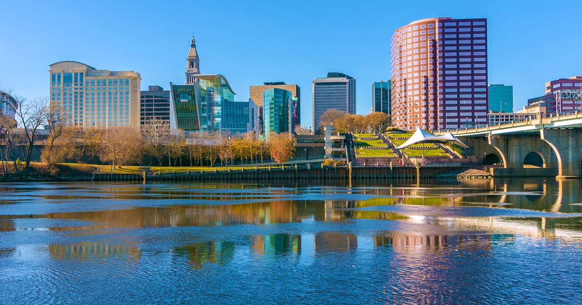 The skyline of downtown Hartford Connecticut at dusk from across the