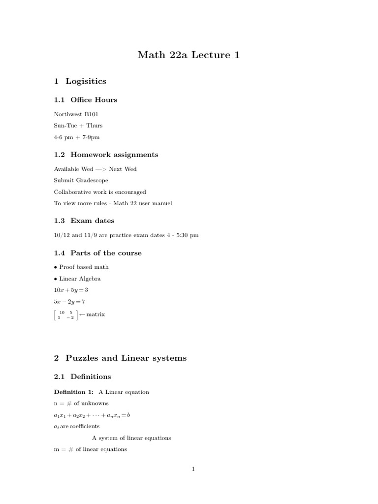 Linear Algebra Harvard Notes Lecture 1 PDF System Of Linear