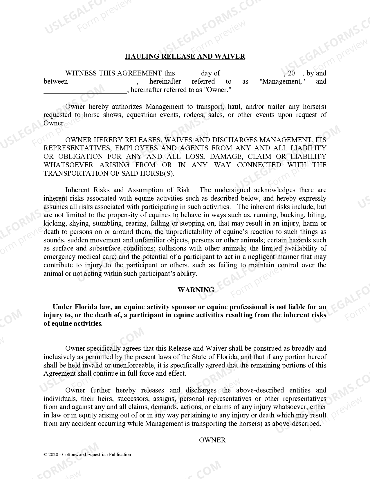 Florida Hauling Release and Waiver Horse Equine Forms Horse