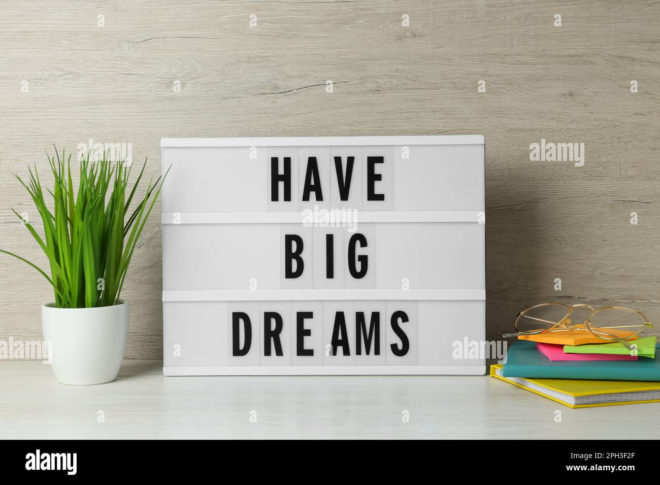 Lightbox with motivational quote Have Big Dreams stationery and plant