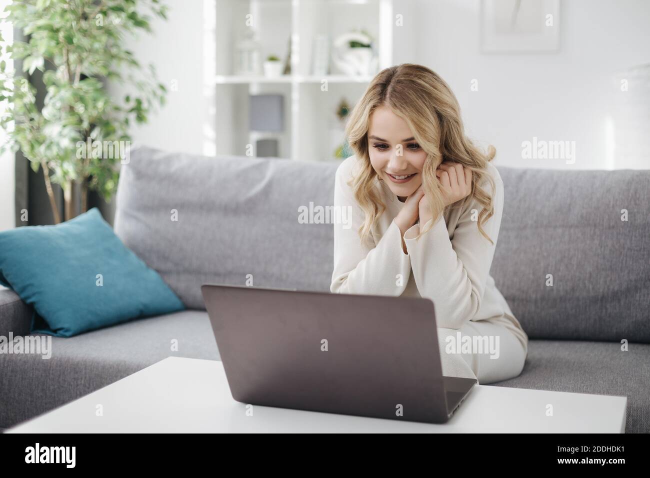 Blonde having online conversation on hi res stock photography and