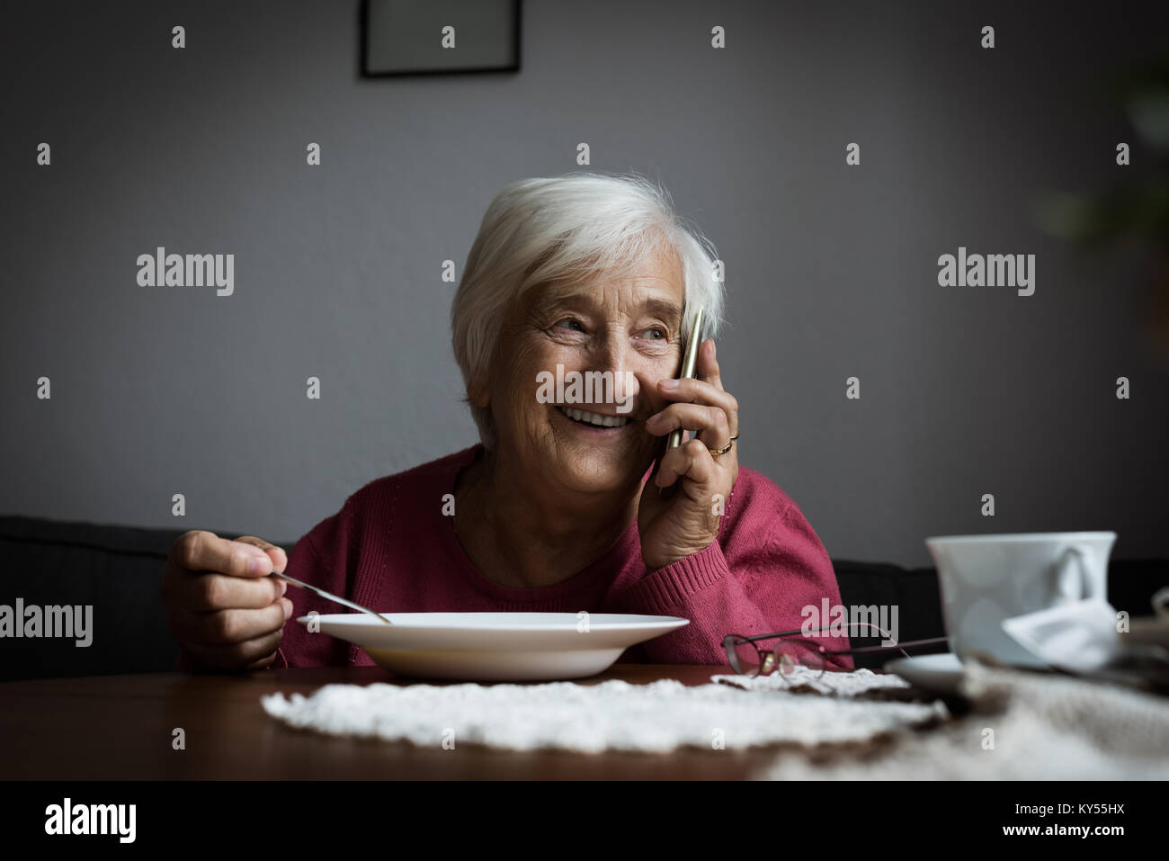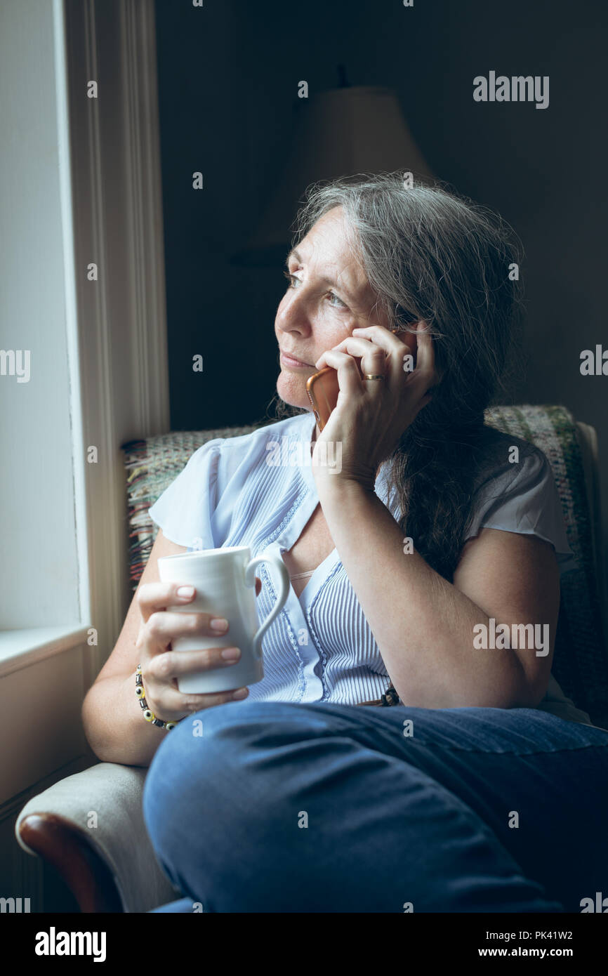 Senior woman having conversation on hi res stock photography and images