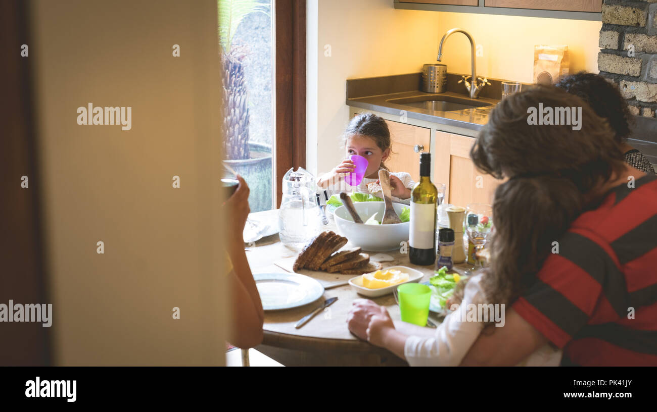 cute family are eating at the dinner table they are having breakfast