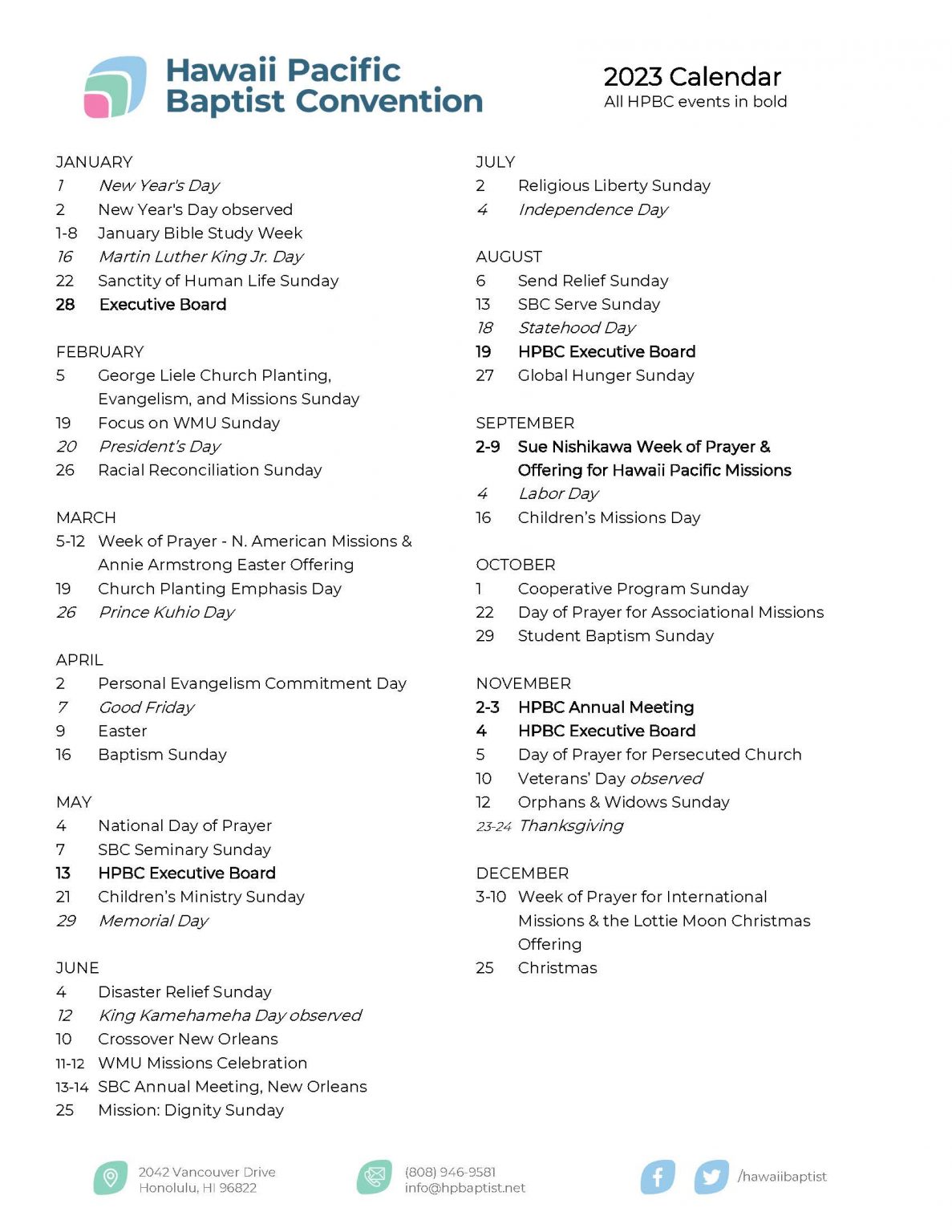 2022 HPBC Calendar Hawaii Pacific Baptist Convention