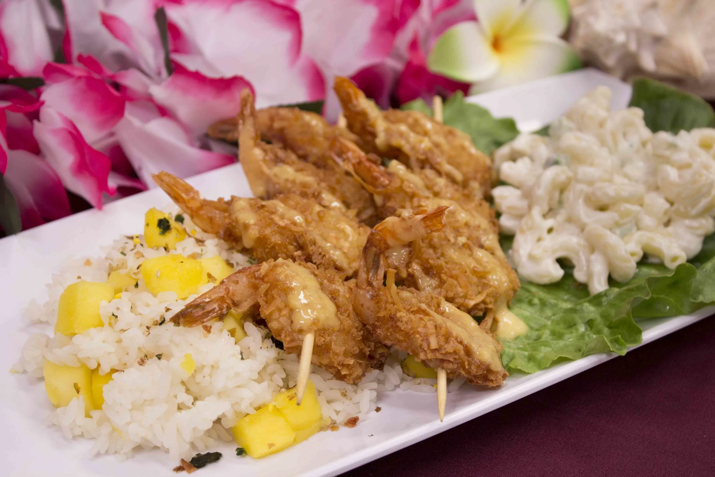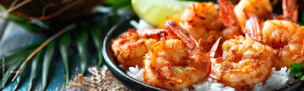Some shrimp that are sitting on some rice coconut shrimp tropical meal