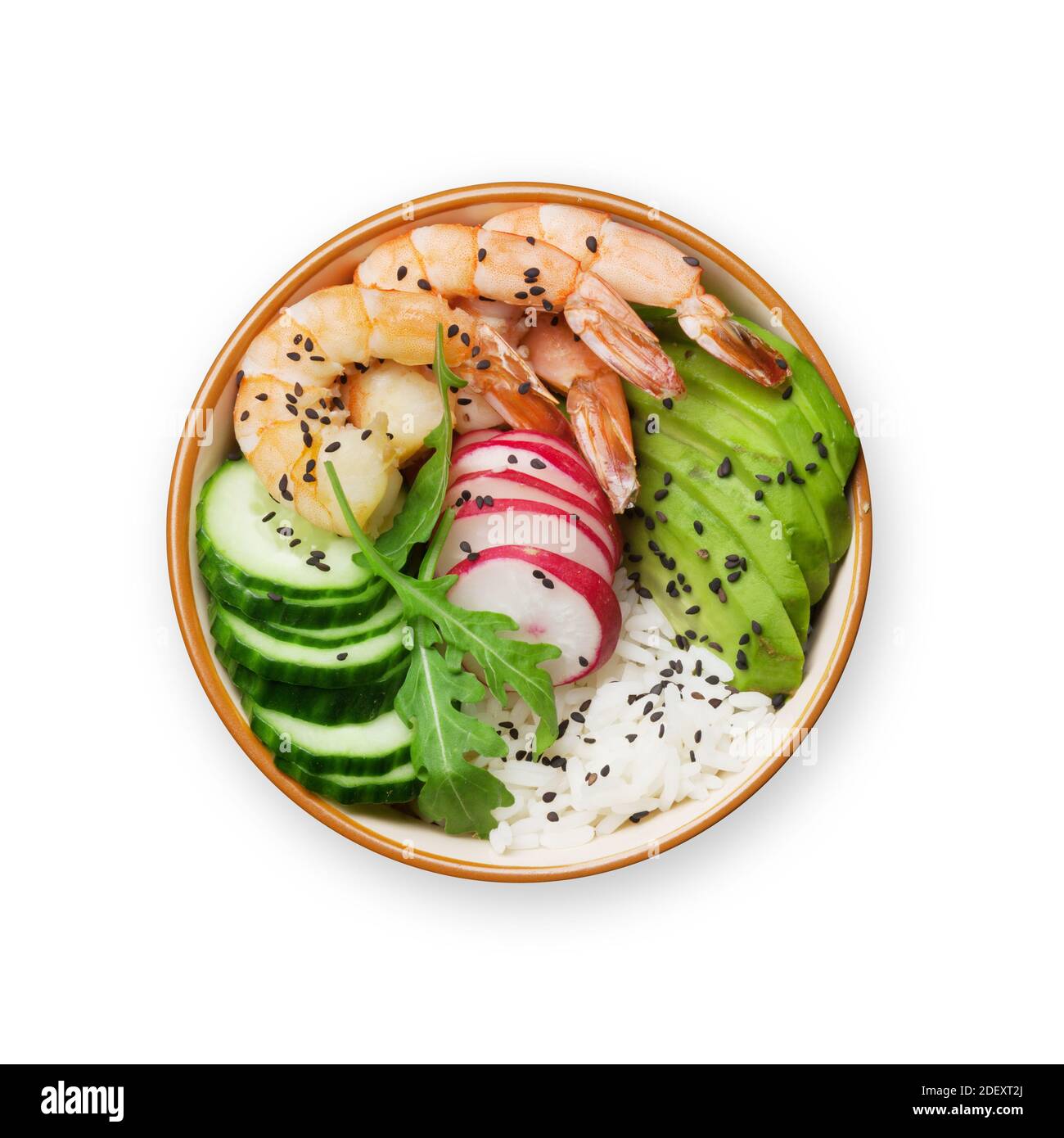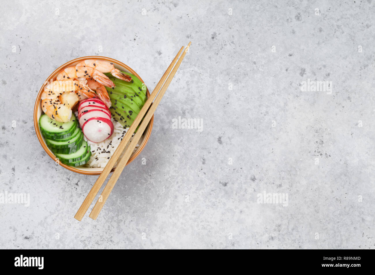 Poke bowl with shrimps and vegetables Traditional Hawaiian raw fish