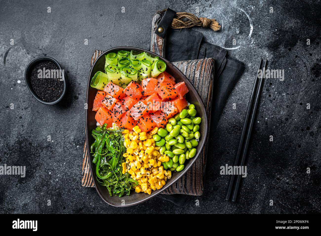 Hawaiian raw fish salad Poke bowl with Salmon Cucumber Edamame and