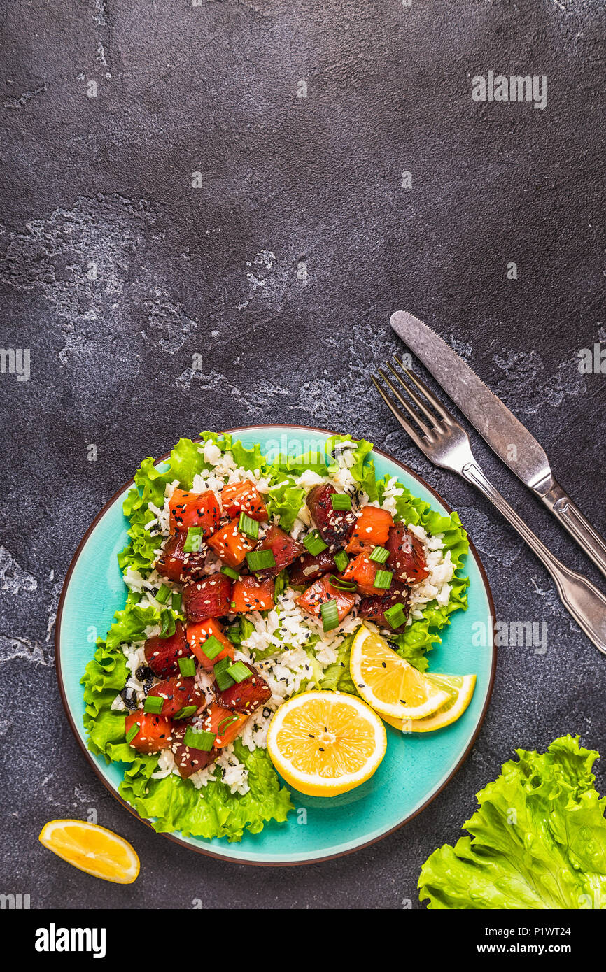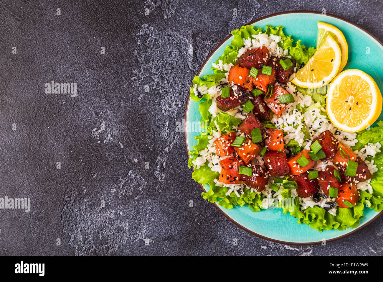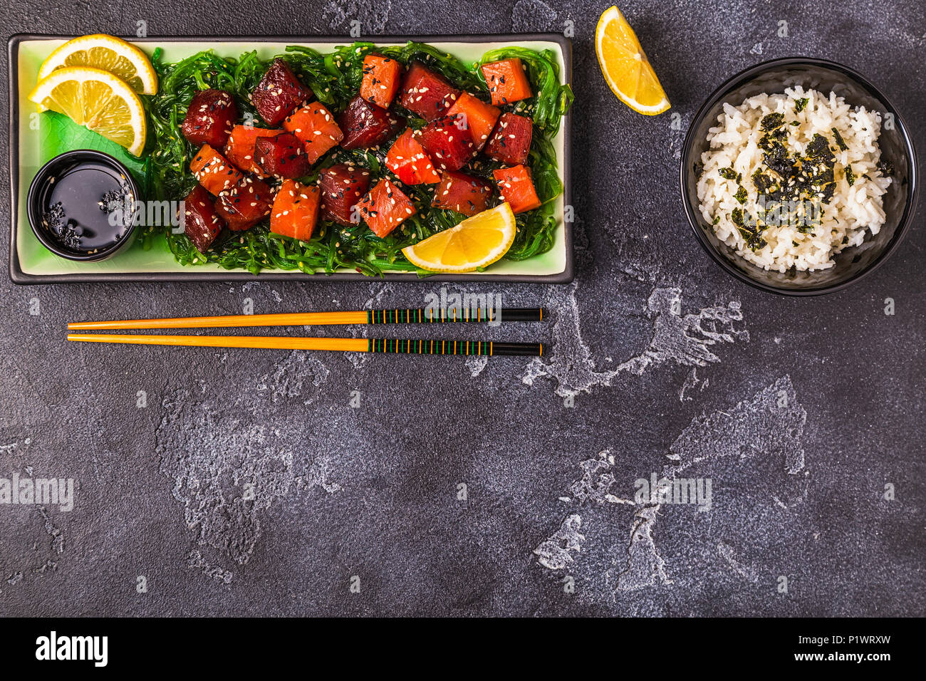 Poke traditional Hawaiian raw fish salad top view Stock Photo Alamy