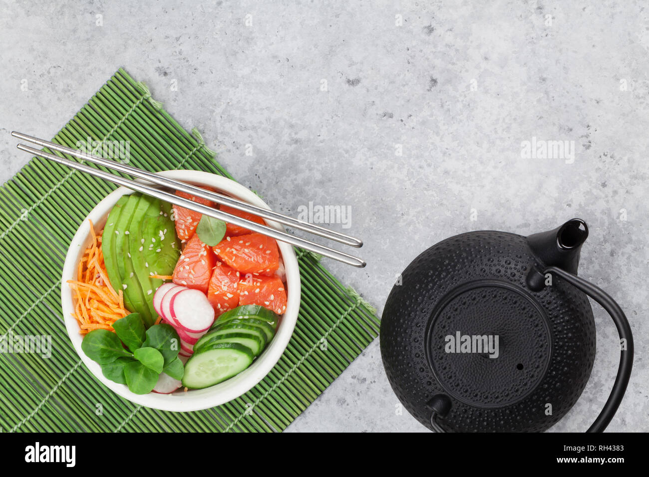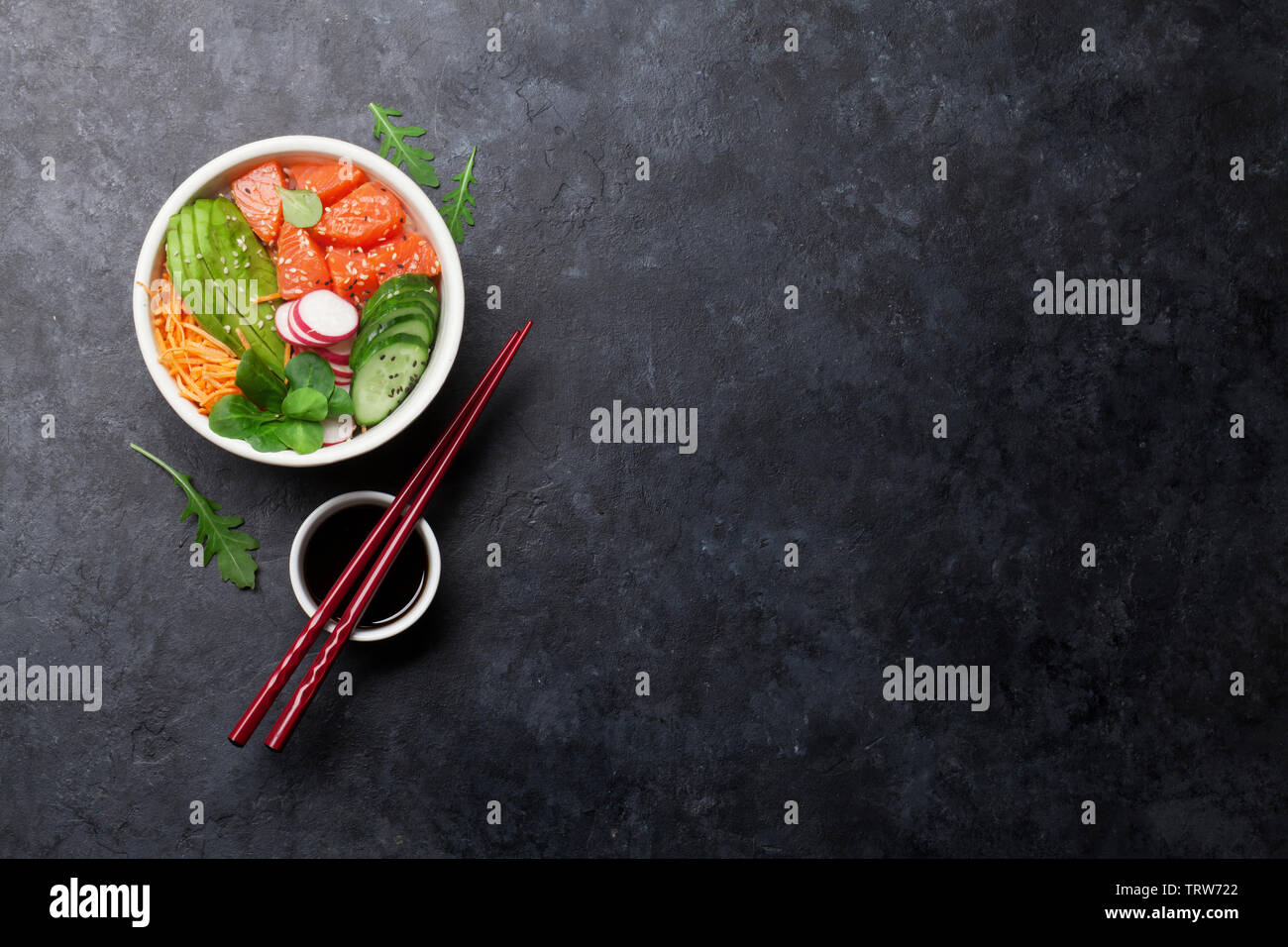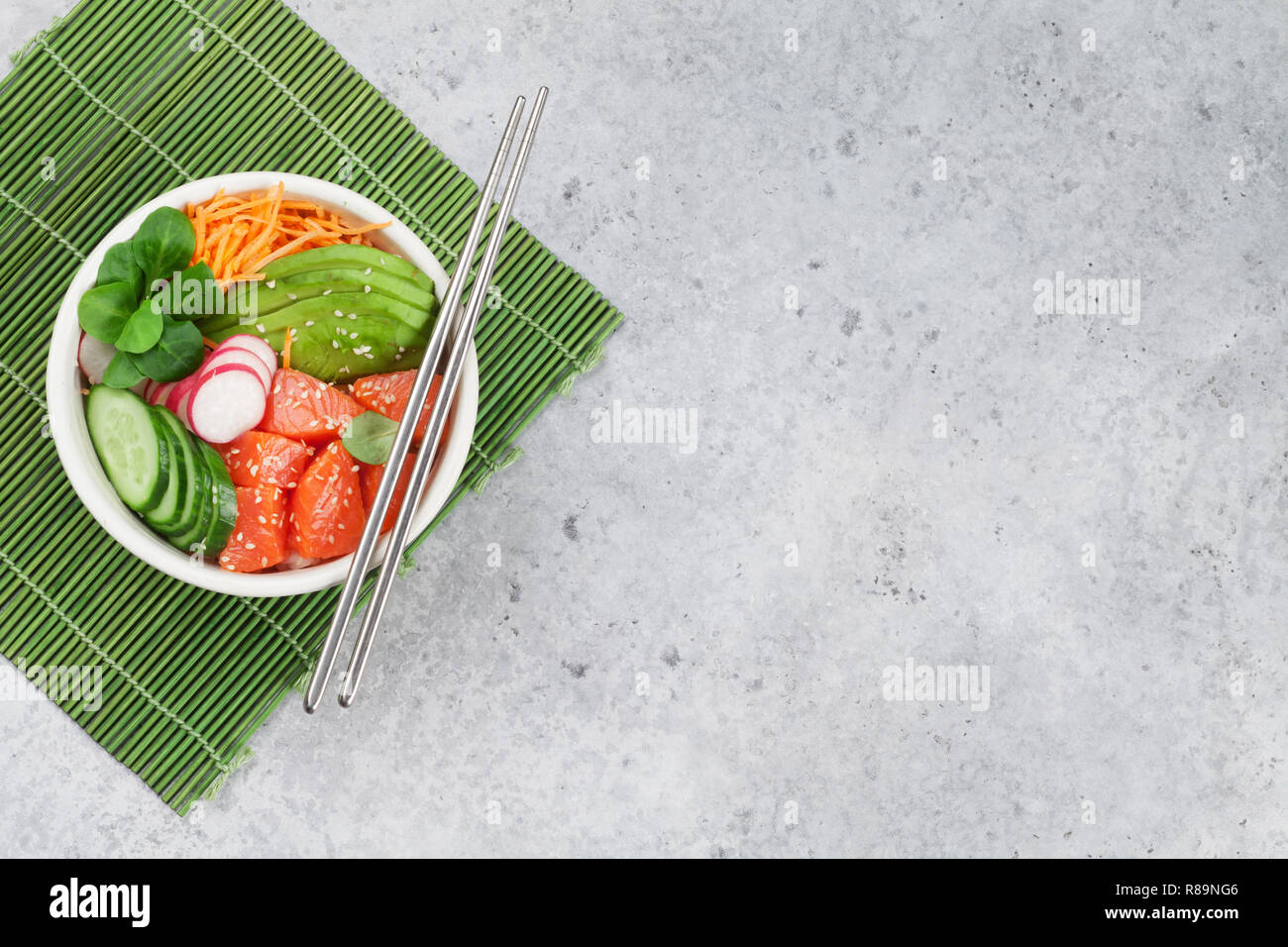 Poke bowl with salmon and vegetables Traditional Hawaiian raw fish